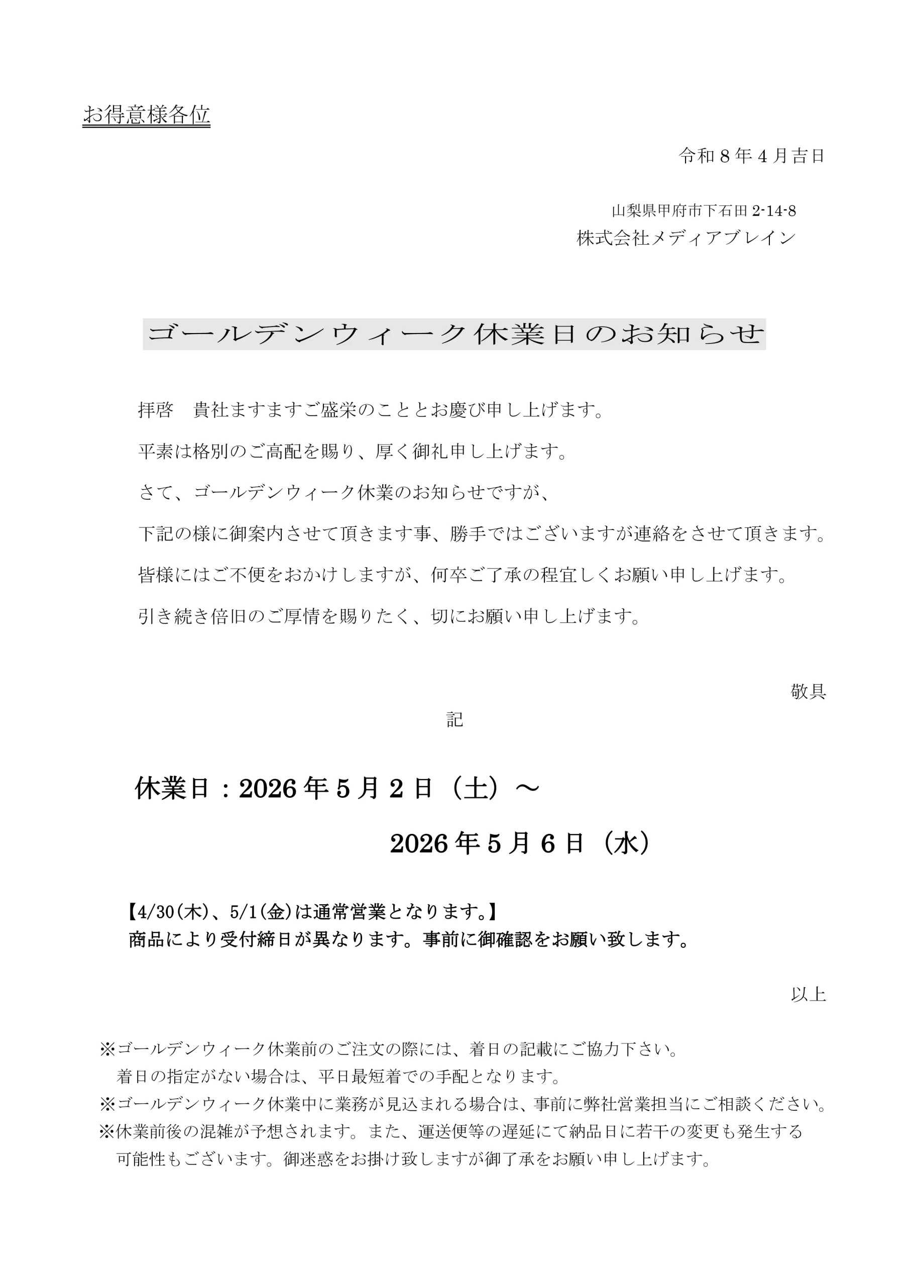 2026年 GW休業日についてのお知らせ 公開済み: 2026年4月7日更新: 2026年4月7日作成者: メディアブレイン運営チームカテゴリー: 最新情報 ゴールデンウィーク休業日 2026年5月2日(土)~2026年5月6日(水) ※4月30日(木)、5月1日(金)は通常営業となります。 商品により受付締日が異なります。事前にご確認願います。 ☆ゴールデンウィーク休業中に業務が見込まれる場合は、事前に弊社営業担当にご相談ください。 ☆ゴールデンウィーク前のご注文の際には、着日の記載にご協力ください。納品指定日のないご注文書については、休業期間を除いた平日最短のご手配となります。 また運送便の混雑が予想され、遅延にて納品日に若干の変更が発生する可能性がございますので、余裕をもってご注文ください。 休業期間中にいただいたお問い合わせにつきましては、営業再開後に順次対応させていただきます。 ご不便をおかけいたしますが、何卒ご了承のほどよろしくお願い申し上げます。 関連記事 【ネットにお店を建てませんか?】人がものを売る時代が終わりました オンライン販売が注目されておりますが、そもそもECサイトとは何でしょうか? ECサイトはモール型と自社サイト型に二分されます。モール型とは楽天市場、Amazon、Yahoo!ショッピング、などのモールに出店するタイプです […] 公開済み: 2023年6月26日更新: 2023年8月2日作成者: media-bカテゴリー: お知らせ, ランディングページ, 最新情報 【競争力UP】バナー制作で、視覚的な強化 バ ナ ー 制 作 を 承 って お り ま す! お客様の目的に沿った効果的なコンテンツ作成をお手伝いしています。 弊社では以下のようなバナー制作サービスを提供しております。 1.完全オリジ […] 公開済み: 2023年5月22日更新: 2023年6月6日作成者: media-bカテゴリー: お知らせ, ホームページ・DTPデザイン, 最新情報 【ブランドイメージの統一】パッケージ制作で価値観や個性を表現 大切な商品を、他の商品と差別化しませんか? パッケージデザイン制作には、 以下のようなメリットがあります。 1. 競合商品との差別化する 2. 独自のデザイン要素や形状を使用することで、より早く認識される […] 公開済み: 2023年5月29日更新: 2023年6月6日作成者: media-bカテゴリー: お知らせ, ホームページ・DTPデザイン, 最新情報